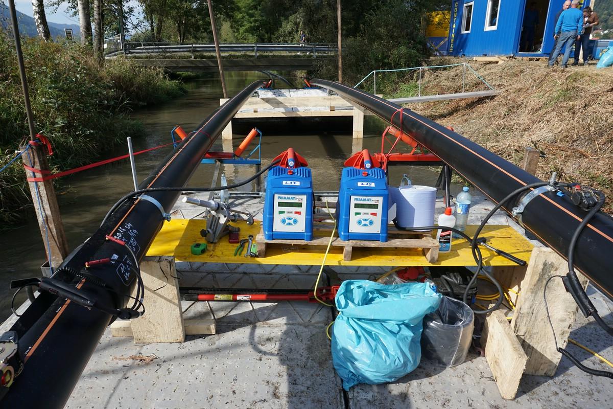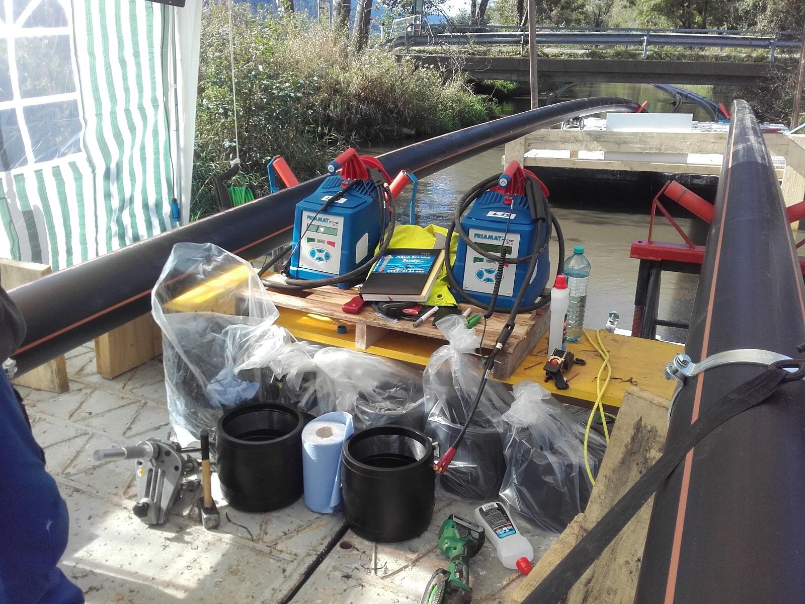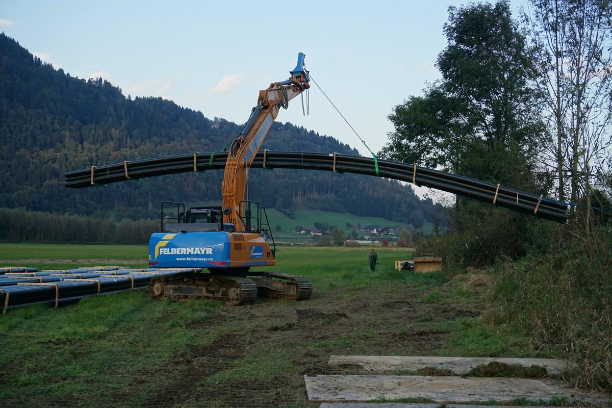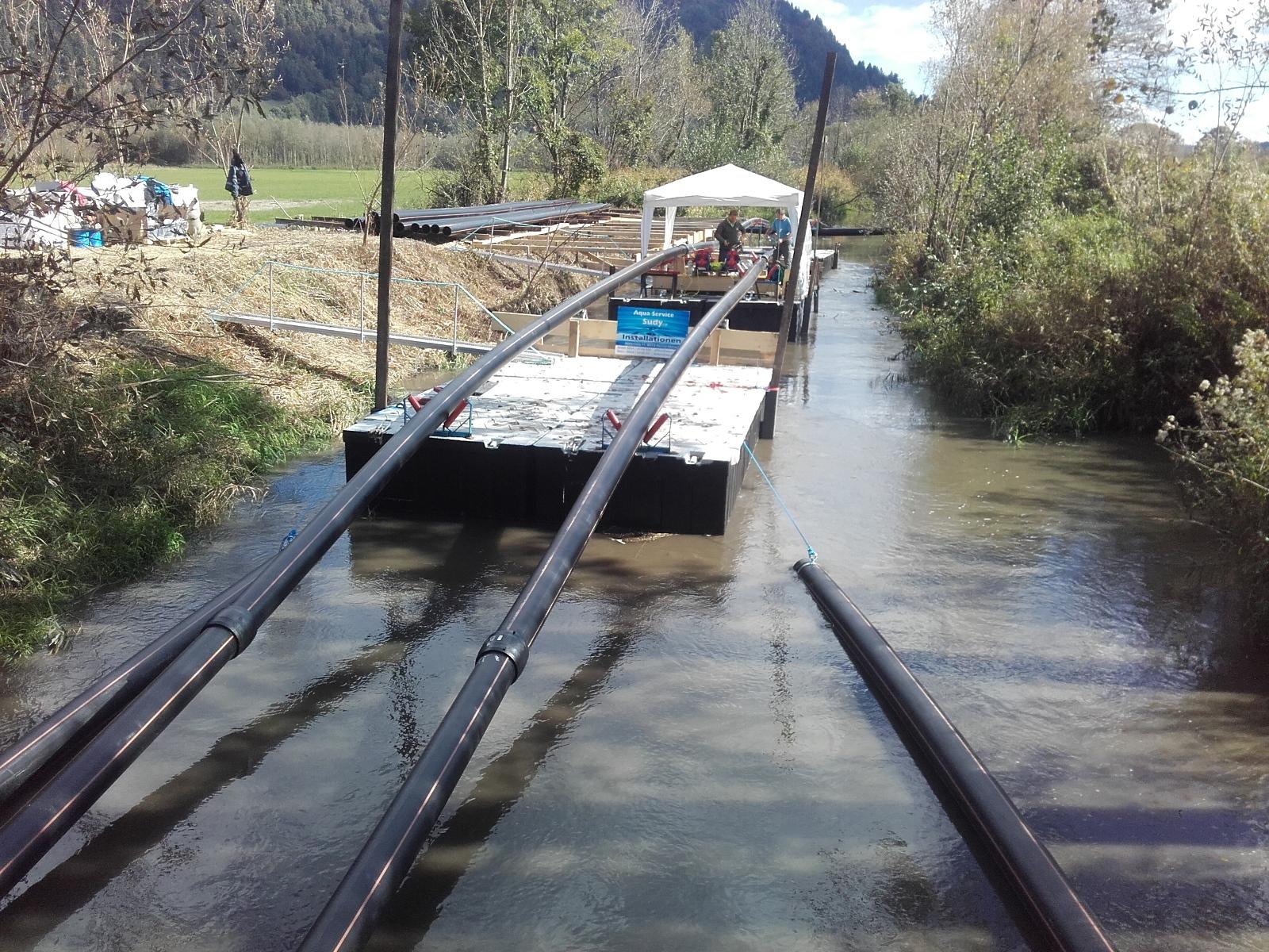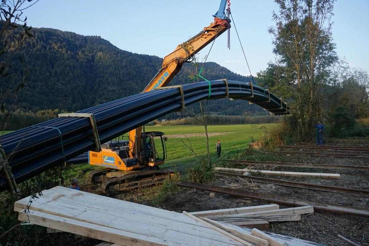 Leitungen aus Polyäthylen sind flexibel, glatt, sehr widerstandsfähig und können verschweißt werden. Der Werkstoff ist sehr zäh, die Rohre können nur durch hohe Temperaturen oder durch scharfe Gegenstände (Werkzeuge oder spitze Steine in Verbindung mit Bewegung) zerstört werden. Da das Material leichter ist als Wasser, schwimmen die Leitungen, auch wenn sie vollständig mit Wasser gefüllt sind. Um sie am Seeboden zu liegen zu bringen, müssen die Leitungen mit Gewichten ballastiert werden. Die Beschwerung wurde so gewählt, dass die Leitungen durch Füllen mit Luft wieder aufgeschwommen werden können. In der ersten Ausbaustufe (1970) wurden die Rohre in 50m langen Stangen per Eisenbahn antransportiert und nachts (bei ruhendem Bahnbetrieb) auf der Strecke ausgeladen. Die Rohre wurden an Land im Bleistätter Moor verschweißt, ballastiert und über die Tiebel in den See eingeschwommen. Nachdem sie durch Motorboote richtig platziert waren, wurden die Leitungen durch Füllen mit Wasser auf den Seegrund abgesenkt. Dies ist nur durch die Flexibilität der Leitungen möglich.