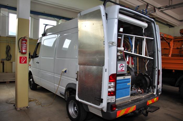 Die notwendigen Werkzeuge, Ersatzteile, Sicherheitsausrüstung, Kamerazubehör und die steuerbare Kabeltrommel befinden sich im hinteren Teil des Fahrzeuges. Die vor Ort aufgenommenen Kanalinspektionsdaten werden nach der Rückkehr zum Betriebsgebäude auf den Server überspielt. In weiterer Folge wird die Auswertung der Inspektionsdaten vorgenommen und die entsprechende Sanierung in Abhängigkeit von der Schadensart in Auftrag gegeben.