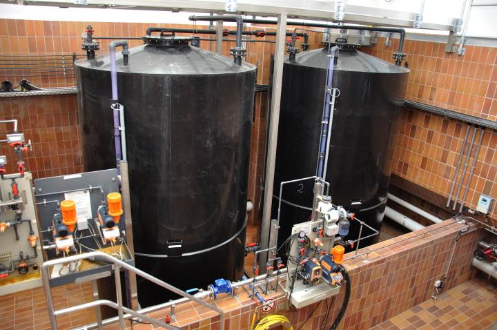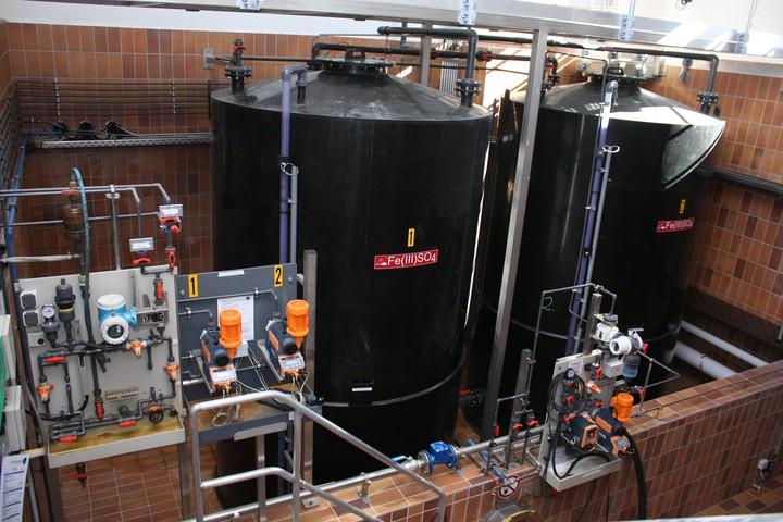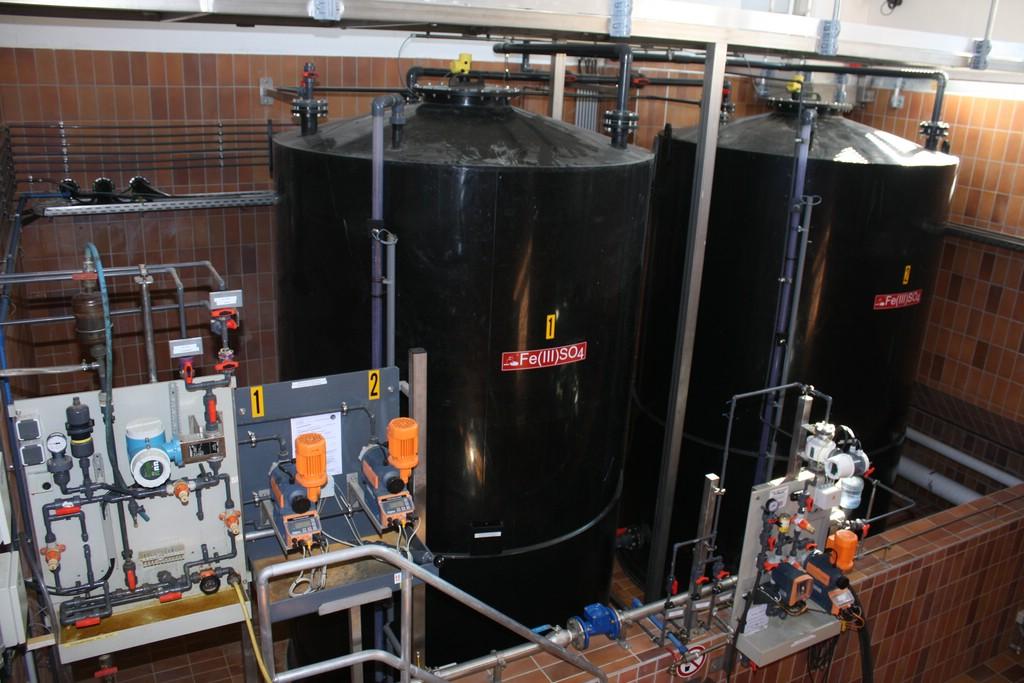 Das Fällmittel und die Lauge werden wahlweise in getrennten Leitungen zu den Dosierstellen beim Zwischenpumpwerk, beim Ablauf Belebungsbecken und beim Zulauf Sandfang gepumpt.