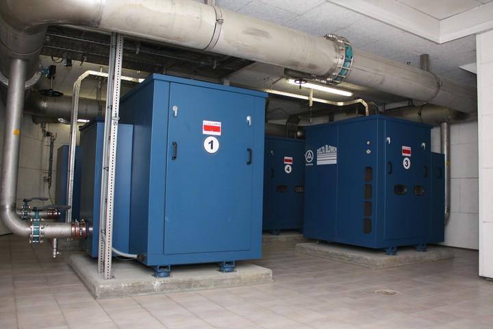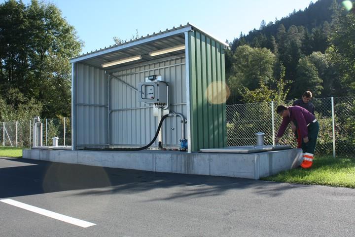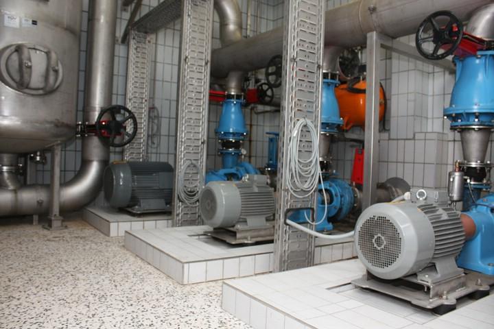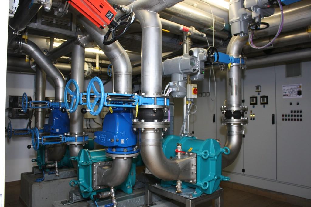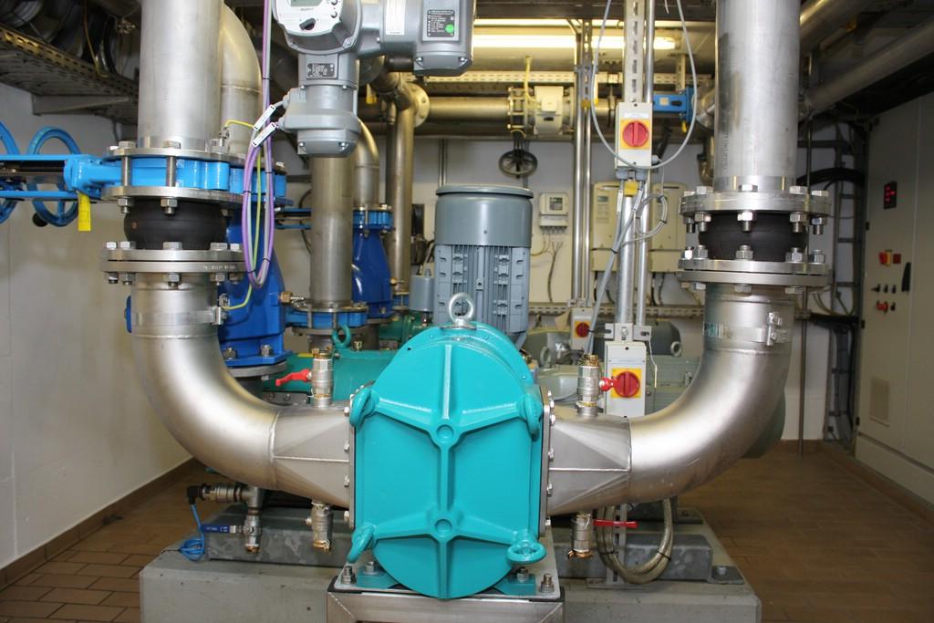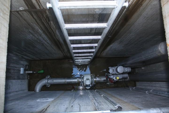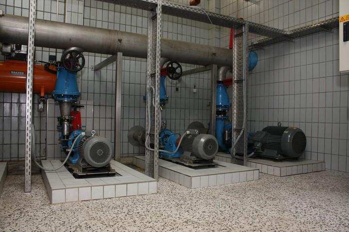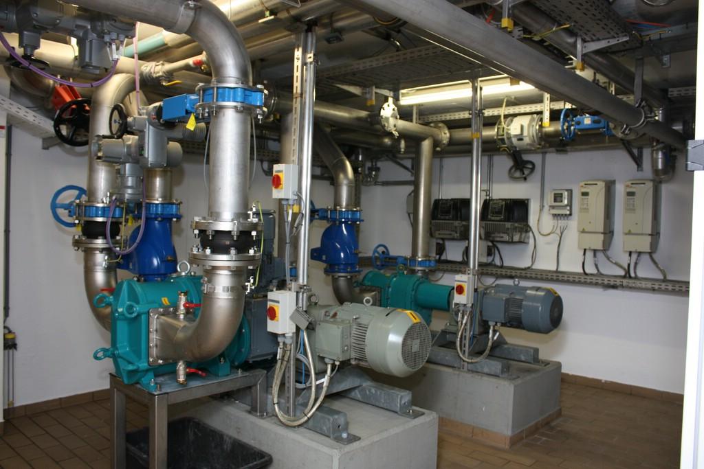 Dazu wurde ein Pumpwerk mit trocken aufgestellten Kreiselpumpen installiert. Der Vorlagebehälter für die Pumpen befindet sich unmittelbar vor dem Gebäude. Dieser ist unterirdisch mit einer Betondecke und entsprechenden Einstiegsöffnungen versehen.