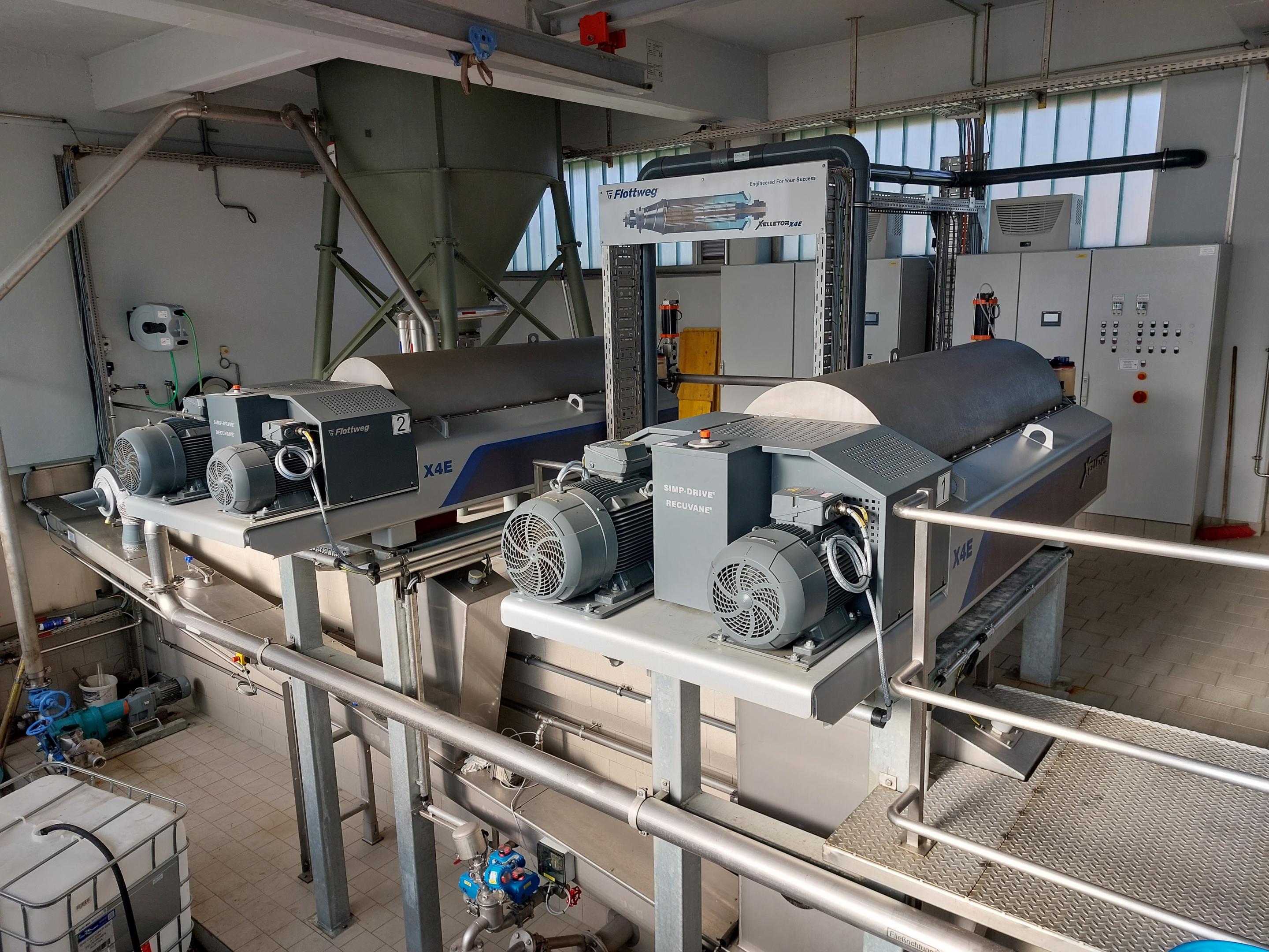 In der Zentrifuge wird dem Schlamm nochmals ein erheblicher Teil des Wassers entzogen, wodurch eine deutliche Feststoffkonzentration erreicht wird. Auch in diesem Prozessschritt kommen Flockungshilfsmittel zum Einsatz.