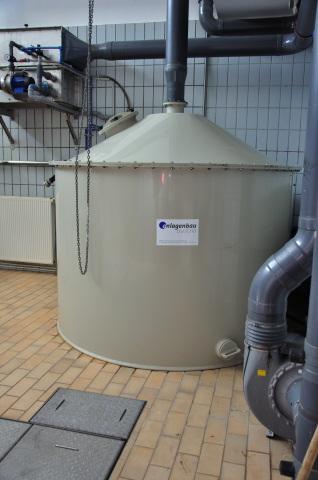 Weiters kann es durch den biologischen Prozess zu einer Absenkung des pH-Wertes in der Kläranlage kommen. In solchen Fällen muss der pH-Wert mit einer Lauge wieder in den neutralen Bereich gebracht werden. Dazu ist in diesem Gebäude eine Laugendosiereinheit geschaffen worden. Die Lauge zur Neutralisation des Abwassers wird in Gitterboxen zu max. 1 m³ gelagert.