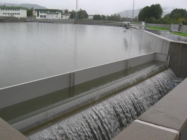 Als weitere Innovation im Bereich der Klärtechnik wurde eine Mischwasserbehandlung im Nachklärbecken realisiert. Dabei wird die obere Schicht des Abwasser-Regenwassergemisches im Regenrückhaltebecken, die bedingt durch die Sedimentation im Becken arm an Schwebstoffen ist, an der biologischen Stufe vorbei, direkt in die Nachklärbecken geleitet.