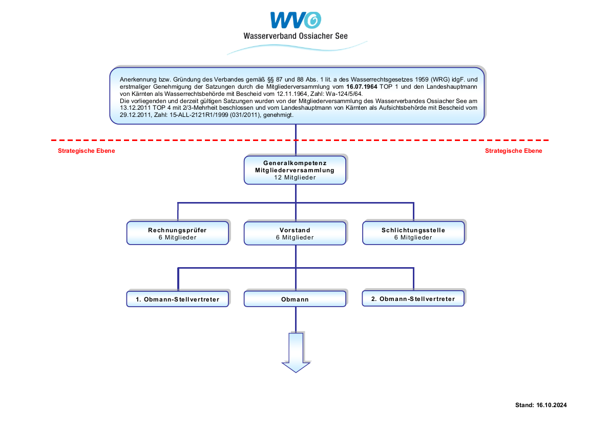 Der vorliegende Auszug aus den derzeit geltenden Satzungen wurde von der Mitgliederversammlung des Wasserverbandes Ossiacher See am 13.12.2011 mit Zweidrittelmehrheit beschlossen und vom Landeshauptmann von Kärnten als Aufsichtsbehörde mit Bescheid vom 29.12.2011, Zahl: 15-ALL-2121R1/1999 (031/2011), genehmigt.